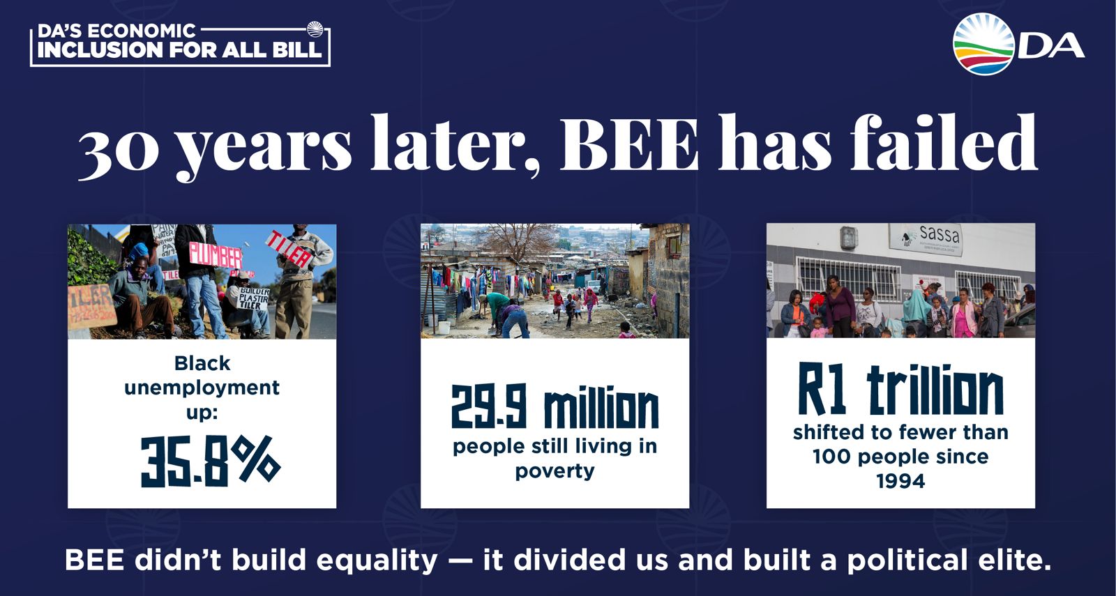 BEE has failed to uplift the lives of South Africans. 44 million people are stuck in poverty, and 12 million are stranded in unemployment queues.